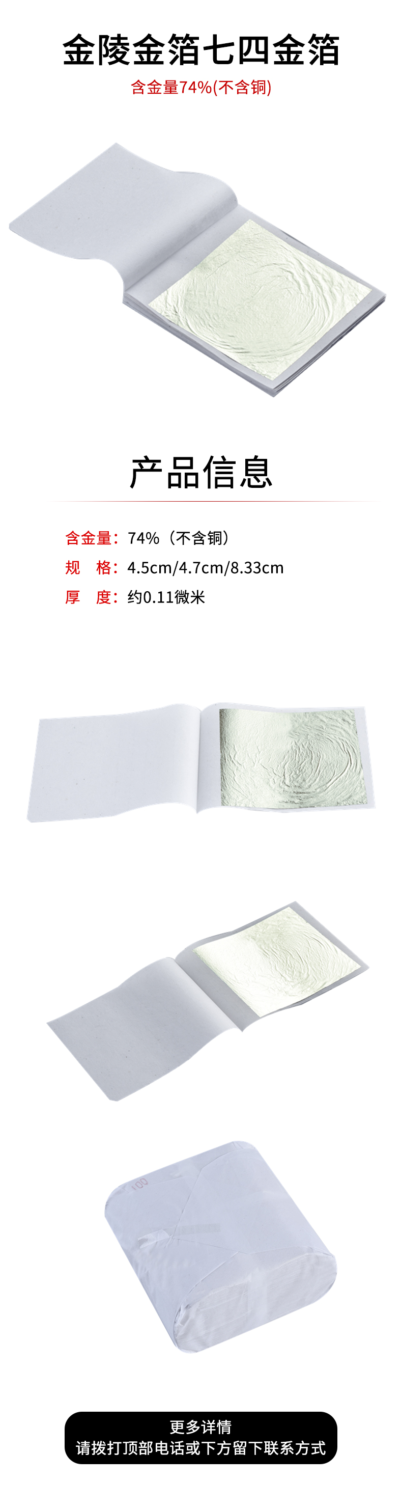 此款金箔常規(guī)規(guī)格為4.5cm、4.7cm、8.33cm,含金量74%,配比過程中沒有添加銅。